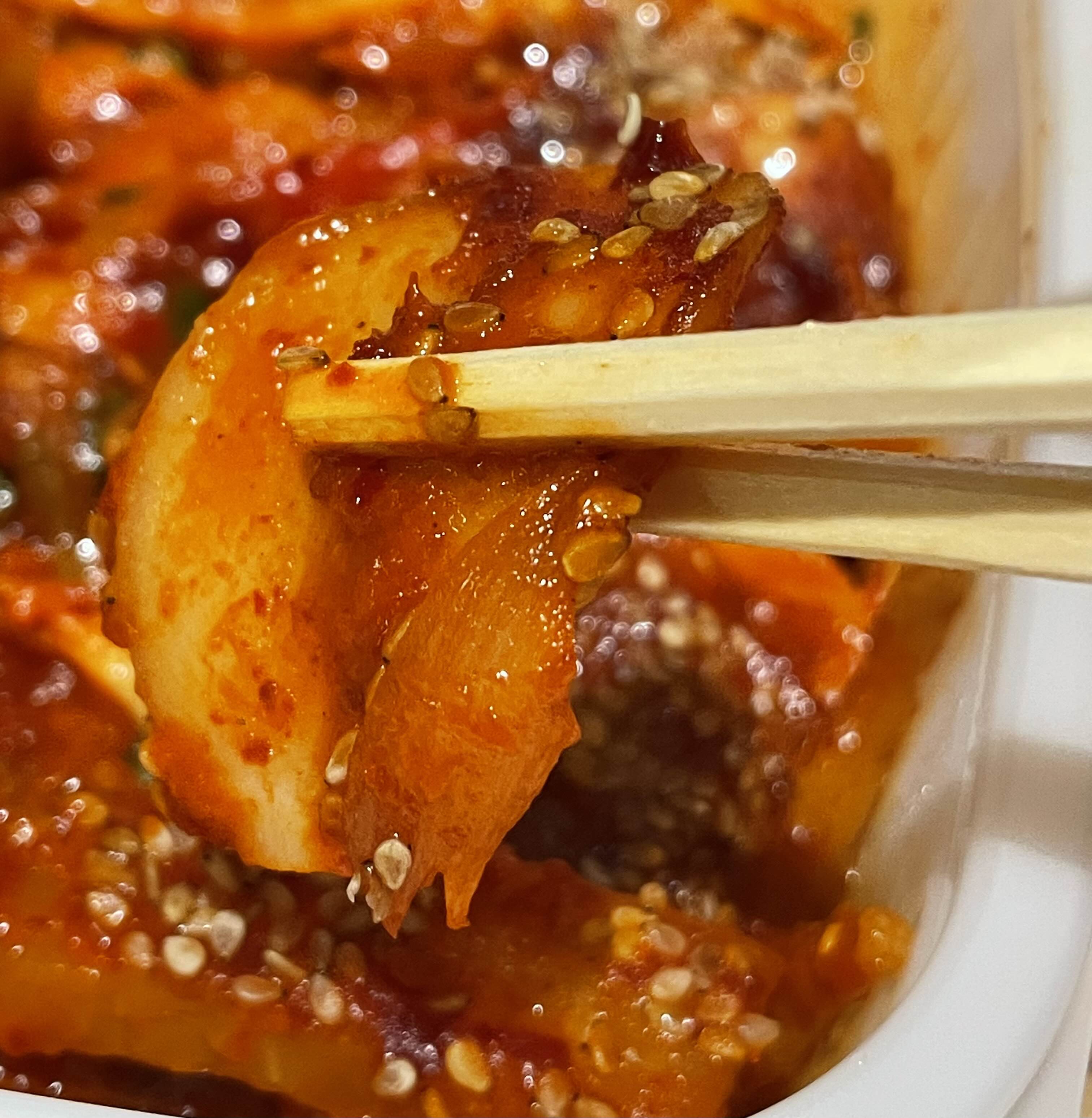 제육볶음 스타일로 야채랑 볶았어요. 예상하지 못한 스타일인데, 밥 반찬으로 안주로 딱 좋았습니다. 설컹하게 씹히는 무, 당근, 양파, 파, 쫀득한 닭발까지!