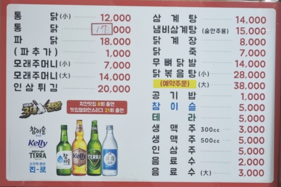 위 메뉴판 참고 하세요. 만7세 4세 아이와 네명에서 주문한 메뉴는 통닭(소/12,000원)x2, 무뼈닭발(14,000원) 입니다.