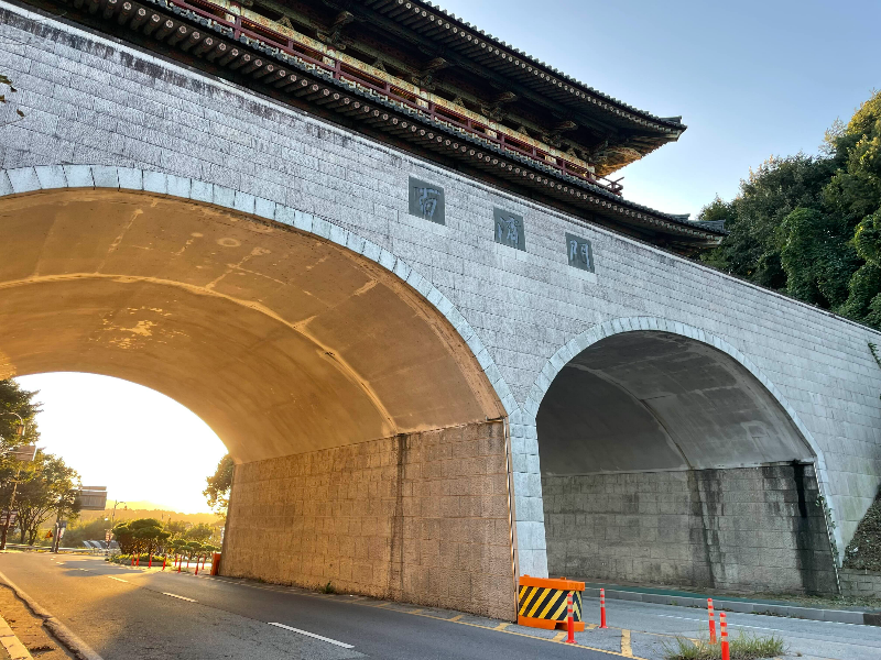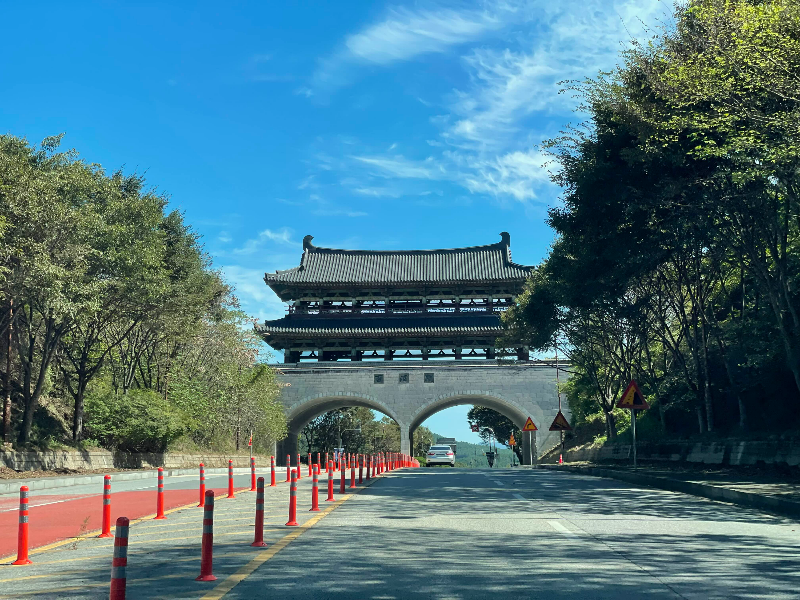 백제문화단지 동측 진입관문입니다. 백제시대 대표 문양전 등을 반영하여 2010년에 완공되었습니다. 롯데리조트 부여에서 출발하여 백제문을 지나 백마강교를 건넙니다. 사진 상 우측 인도로 가는 것을 추천드립니다. 횡단보도를 건너지 않고 부여 중심지로 갈 수 있어요. 좌측 인도로 가면 건널목 2회를 건너야 합니다.