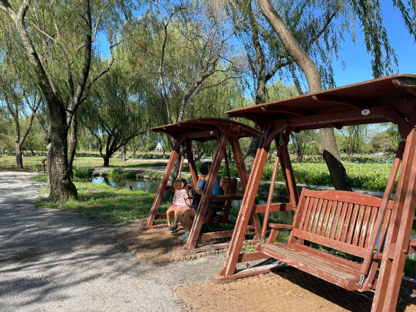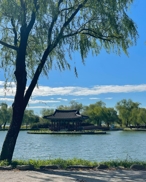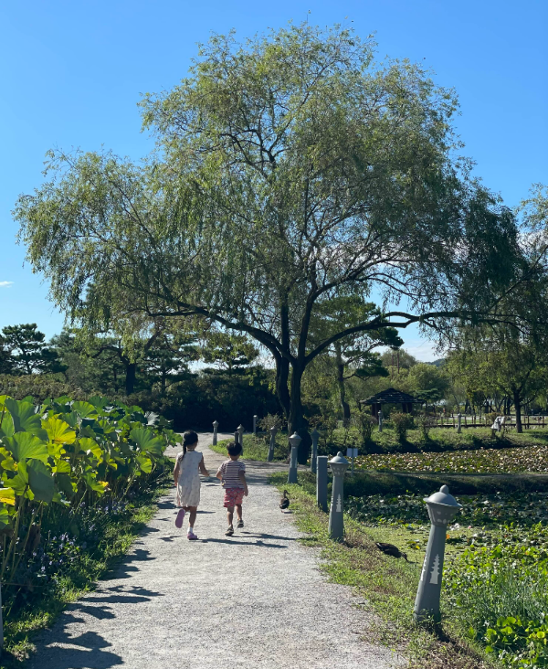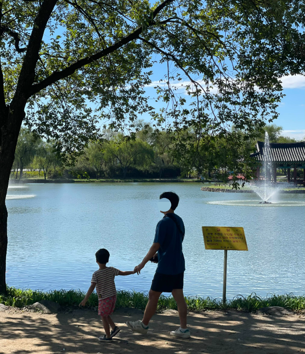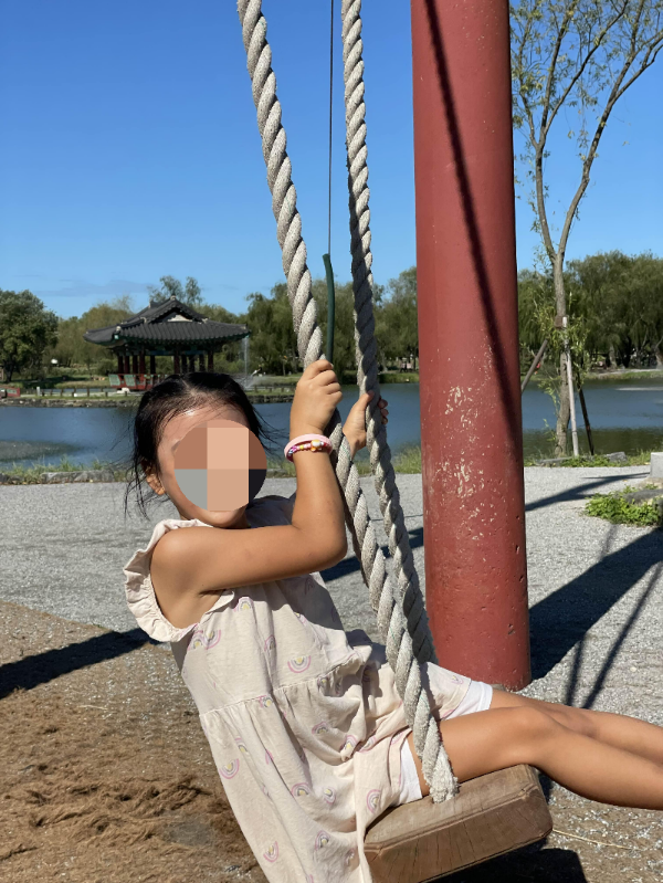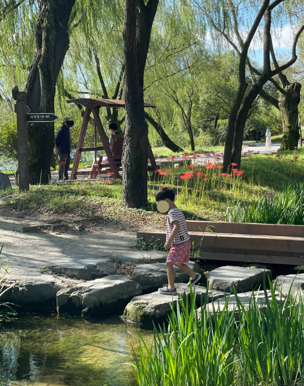 부여 궁남지 서문주차장에 주차를 하고 궁남지로 들어서면 보이는 연꽃밭입니다. 7월~8월에 왔다면 연꽃이 만개해서 아름다웠겠지만 아주 더웠을 거에요. 9월 말은 연꽃잎이 시들어 가지만, 산책하기 정말 좋았어요! 연꽃이 아니라도, 잘 가꾸어진 연못과 조경 덕분에 기분좋은 나들이가 될거에요. 모자이크해서 아이들 표정을 보여드릴 수 없어 아쉽네요. 만7세, 4세 아이들도 정말 좋아했던 곳이랍니다. 분수와 나무그네, 그리고 춘향이가 탔을 법한 커다란 그네까지!