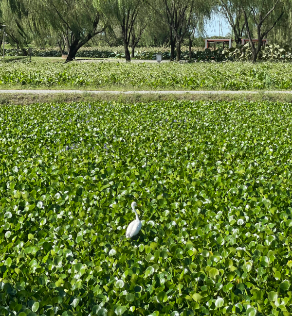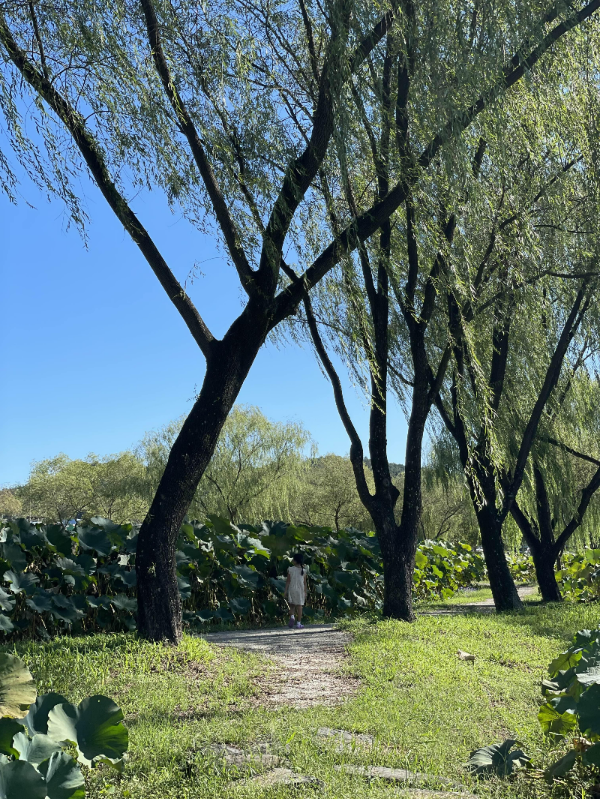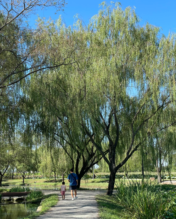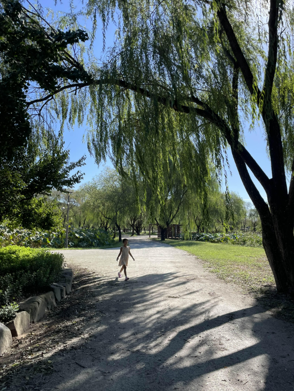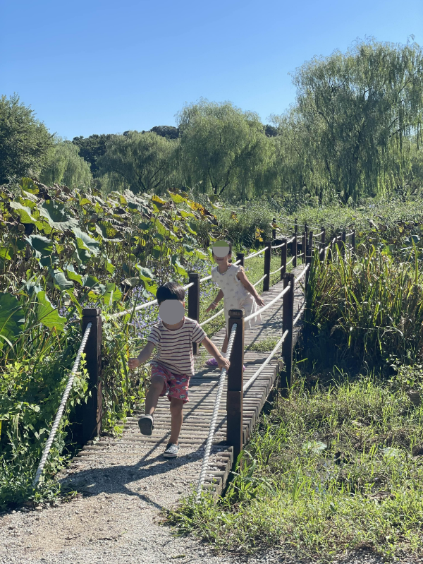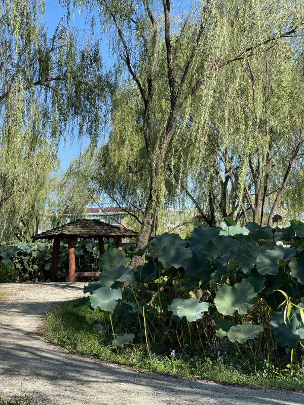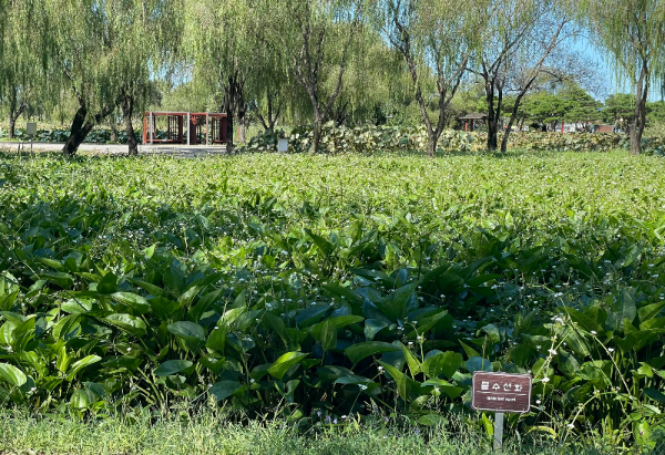 물가라 수양버드나무가 참 많아요. 연잎과 버드나무가 그림 속에 들어온 듯한 느낌이 들어요. 푸른 잎들과 잔잔한 물을 보자니 일상의 피로가 다 날아가는 듯 합니다. 연못에 심겨진 수련, 물토란, 물수선화 그리고 이국적인 식물까지 볼거리가 참 많습니다. 아이들도 하나하나 관찰하면서 걸었어요. 쇠백로와 오리도 보았어요.
