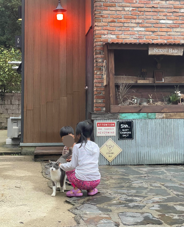 위 사진 속 건물은 여울지숲속캠핑장 관리동이에요. 작은 매점과 공동시설(개수대, 화장실, 샤워실, 공동냉장고)가 함께 있어요. 사진 보시면 김포 여울지숲속캠핑장이 추구하는 분위기가 충분히 전해질 것 같아요. 숲속 캠핑을 하고 싶은 분들께 추천드리는 곳이에요. 고양이가 세마리 있어서 아이들도 정말 좋아했어요 :-)