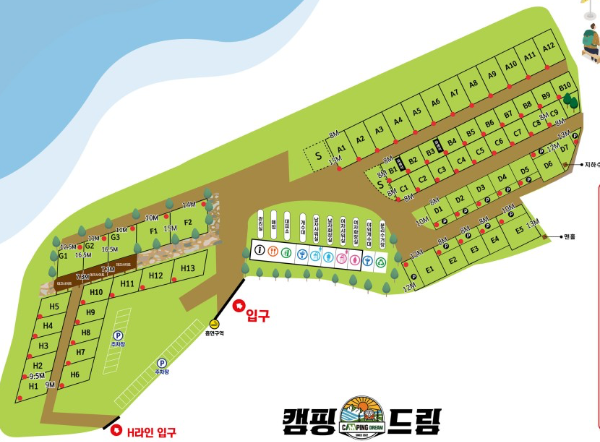 아래 사진 건물에 관리동, 매점, 개수대, 화장실과 샤워실이 있습니다. 도착하자마자 관리동에서 사이트 안내를 받고, 쓰레기 봉투를 수령하고 피칭하러 갑니다.