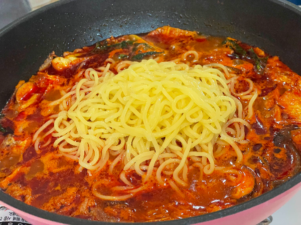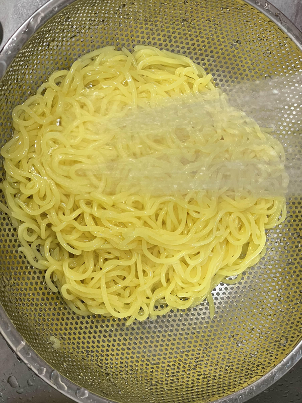 2. 끓는 물에 중화면을 넣고 4분간 끓입니다. (Tip! 면에 붙은 밀가루를 털고 끓는 물에 넣어주세요. 물 2L이상 이면 좋을 것 같어요. 면에 붙은 밀가루 때문에 금방 탁해 집니다.)