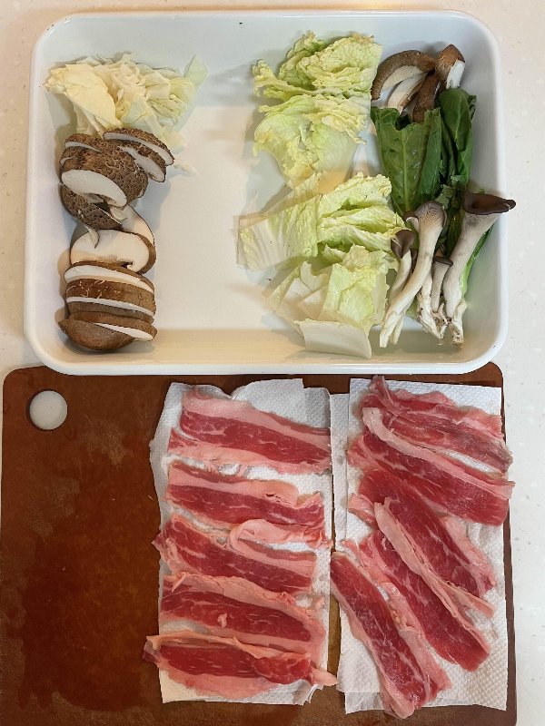 1. 야채를 씻고 자른다(오른쪽). 추가할 야채도 손질한다(왼쪽). 우삼겹은 키친타올로 핏물을 닦는다. 10조각 있어요.