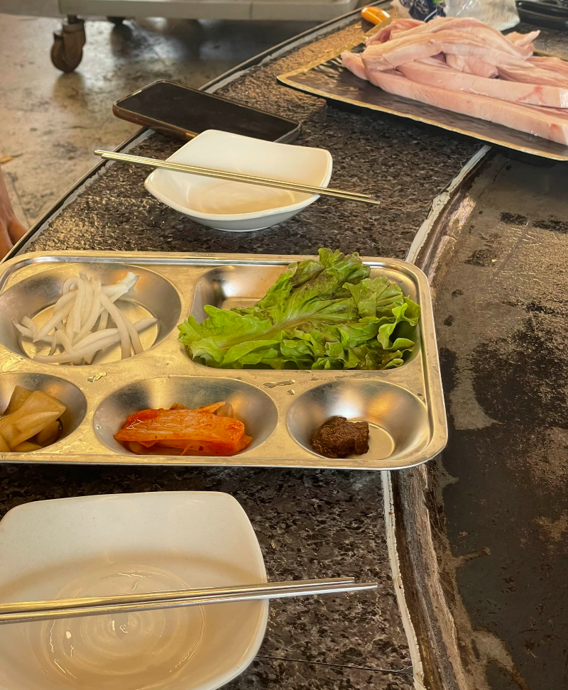 커다란 철판에 낯선 사람들이 둘러앉아 구워먹는 삼겹살 이라니. 들어가자마자 풍경이 재미있어요.