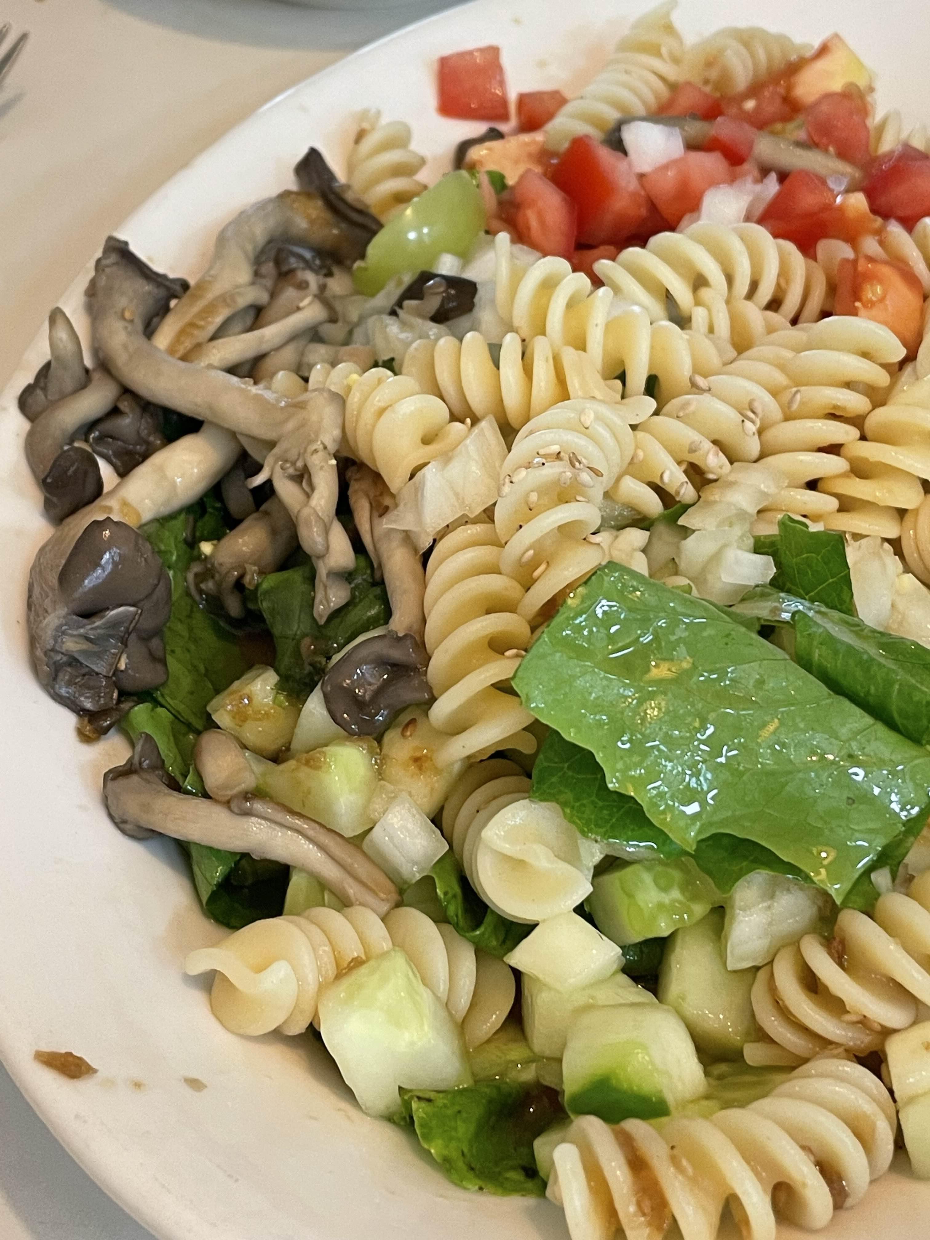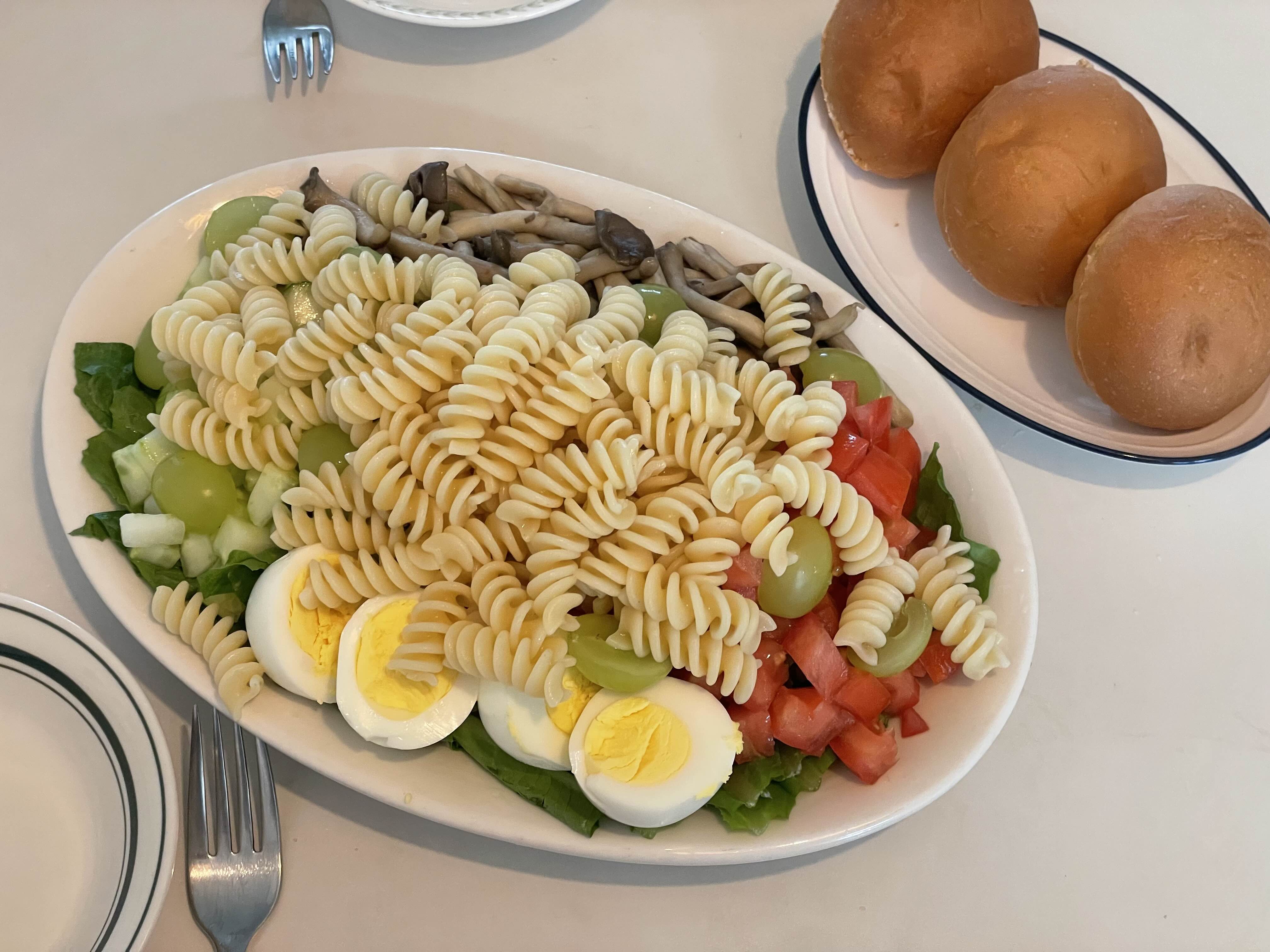 재료 : 양파, 오이, 샐러드채소(로메인), 토마토, 푸실리, 달걀, 오리엔탈소스