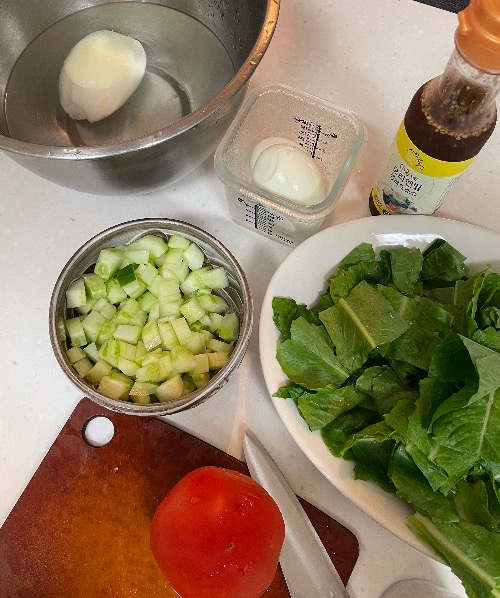 재료 : 양파, 오이, 샐러드채소(로메인), 토마토, 푸실리, 달걀, 오리엔탈소스