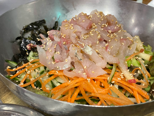 사과가 들어간 게 특징이에요. 덕분에 단맛이 돌고, 채소가 신선해서 맛이 없을 수가 없어요. 회에도 기본적인 양념이 되어 있어요. 전체적으로 조화롭고 맛있습니다.