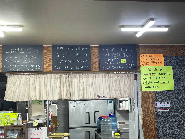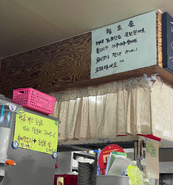 테이블은 10개 정도 있어요. 사장님은 물질하시면서 목소리가 크다고 합니다. 절대 화난거 아니니 오해하지 말라는 협조문이 붙어 있어요.