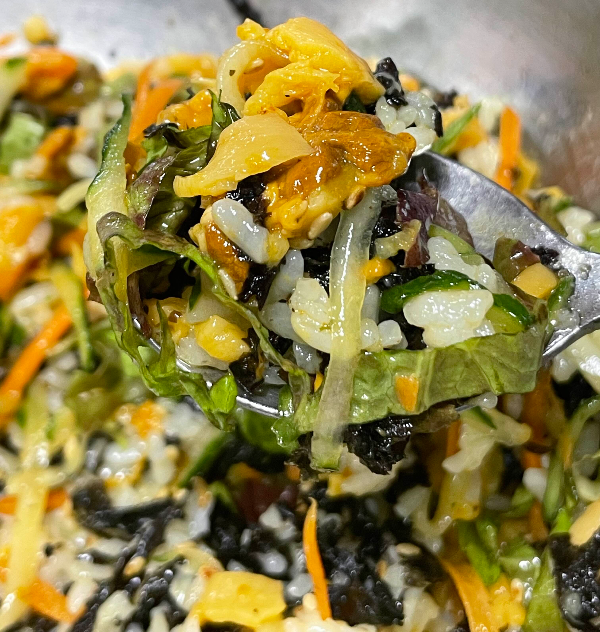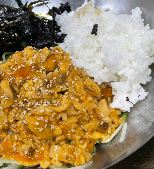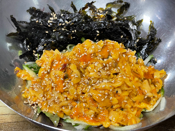멍게 향이 신선하고 거슬리는게 없어요. 밥을 많이 먹진 않아서 1/3 공기 넣어 비벼 먹었어요. 밥을 적게 넣어서인지 따로 간을 안해도 됩니다. 부족한 간은 초고츄장으로 조금씩 더해보세요. 크 진짜 맛있었어요. 미역국이 같이 나옵니다.
