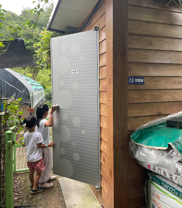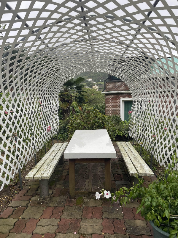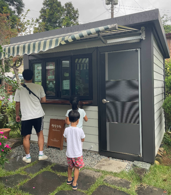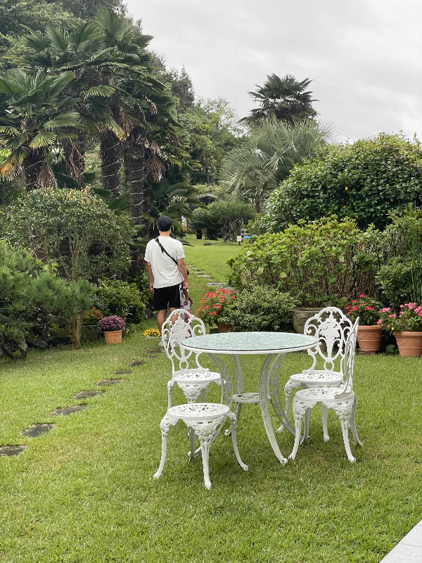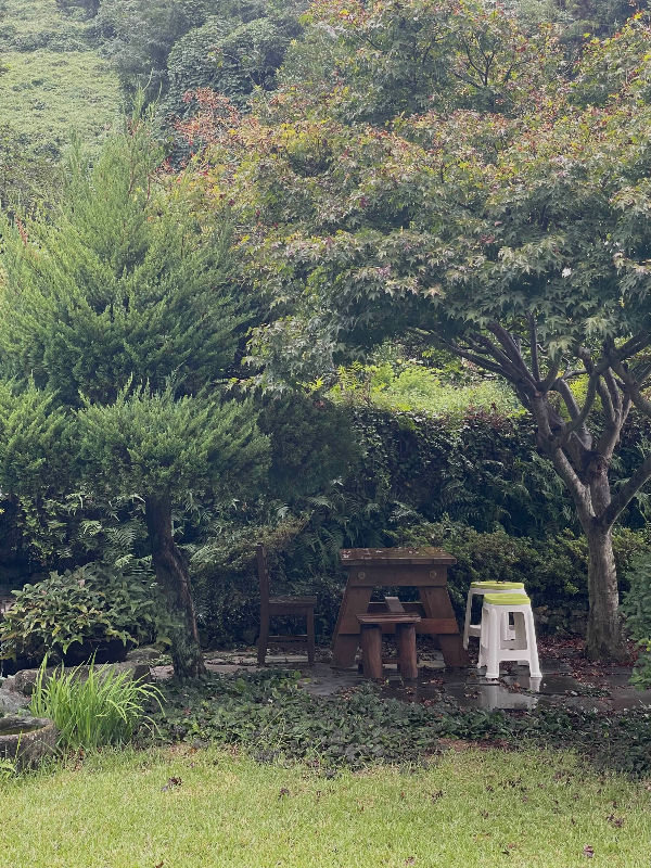 정원이 예쁜 카페에서 야외 분위기를 즐기지 못해 무척 아쉬웠어요. 화장실은 외부에 있습니다.