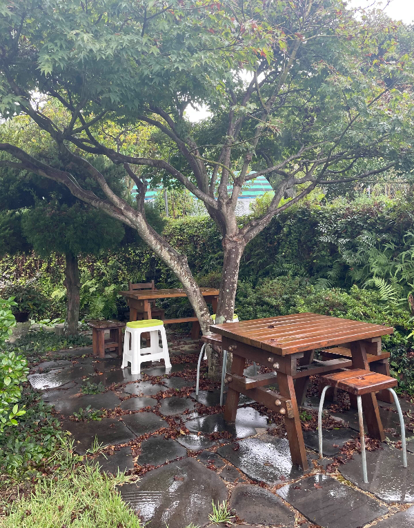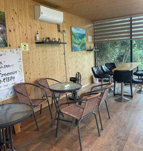 비오는 날 방문해서 정원에 자리 잡진 못하고 실내로 들어갔어요. 실내는 좁은 편입니다. 내부에 테이블 3개, 테라스에 3개 있어요. 에어컨 있습니다.