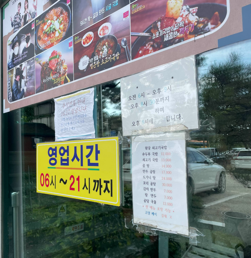 순두부국밥(12,000원), 쇠고기국밥(13,000원), 곰탕(14,000원), 만두곰탕(17,000원), 도가니탕(24,000원), 꼬리곰탕(39,000원), 감자만두(7,000원), 왕만두(7,000원), 곰탕국물(12,000원)