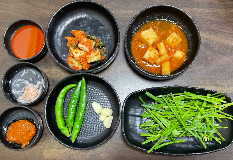 김치, 깍뚜기, 새우젓, 쌈장, 초고추장, 고추와 마늘, 부추