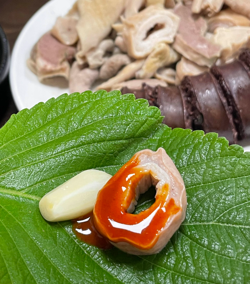 따뜻할 때 소금에 한번 찍어먹고, 새우젓이랑 먹고, 마지막으로 초고추장에 찍어 먹습니다. 조점례남문피순대에서 추천해주시는 먹는 방법은 깻잎 쌈에 피순대를 초고추장에 찍어서 먹는 것입니다. 저는 거기에 마늘을 추가해서 먹었어요. 굿!