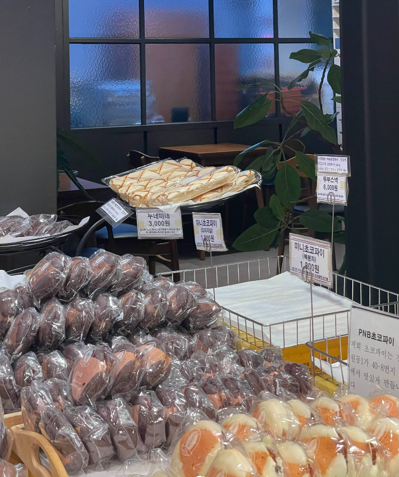 메뉴 : 오리지널 초코파이, 화이트, 녹차, 딸기, 모카, 바나나 초코파이, 누네띠네, 양갱, 붓세 등