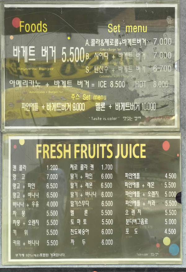 메뉴는 아주 심플합니다. 바게트버거(5,500원), 과일, 음료 있습니다. 저희는 바게트버거 두 개와 아이스아메리카노 먹었어요.