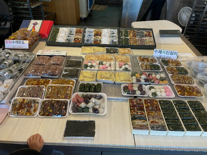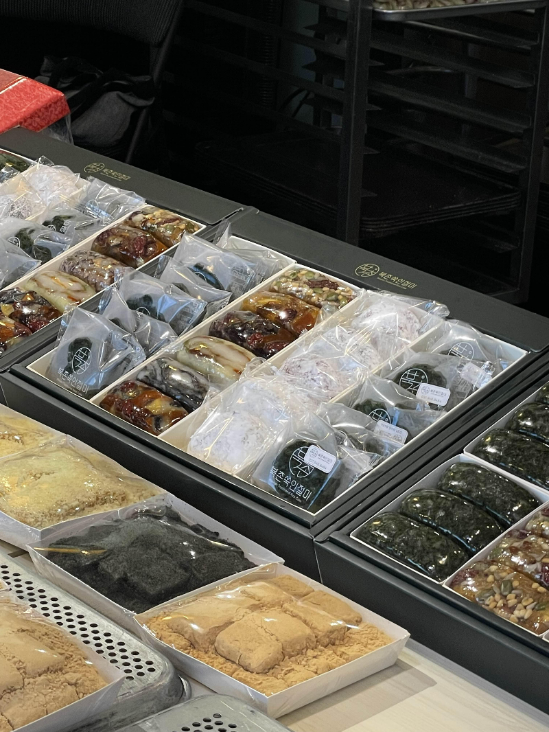 카스테라 호박 흑임자, 콩떡, 흑미, 팥시루, 단호박, 약식, 호박말이, 쑥말이, 꿀떡 등 맛있는 떡이 가득해요. 콩가루도 따로 담아서 1,000원에 팔아요.