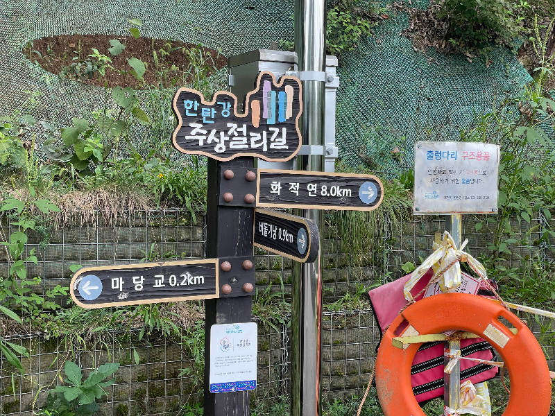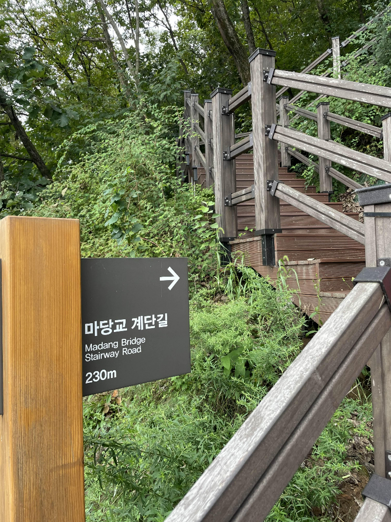 하늘다리를 다 건너면, 마당교 가는 표지판이 있어요. 경사길로 가도되고, 계단길로 가도 됩니다. 같아요.