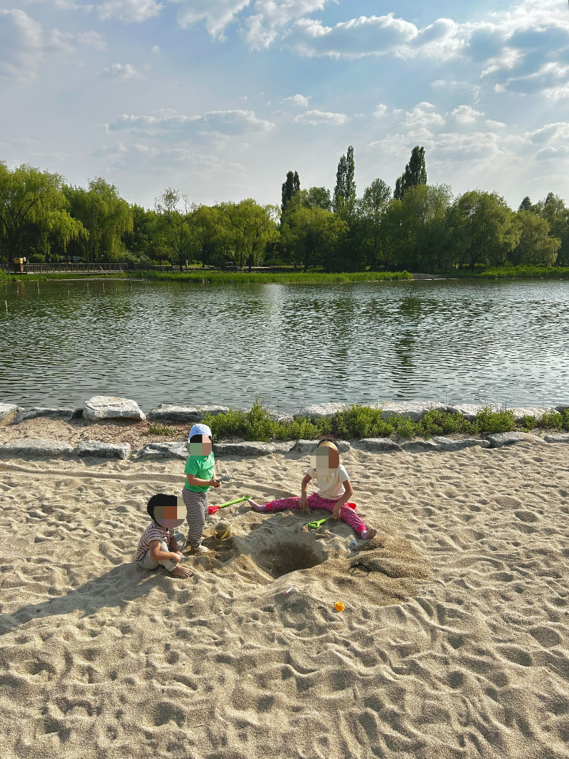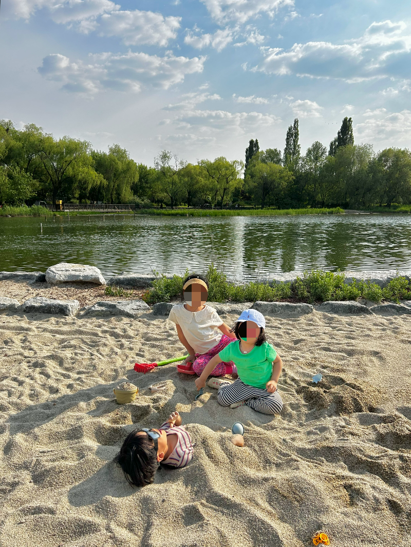 저희집 두 아이는 모래놀이를 정말 좋아요. 시간 가는 줄 모르고 놀거든요. 그런데 연못 바로 옆에 있는 모래놀이터라니! 엄마도 만족하는 곳을 소개할게요. 사진은 정말 예쁘게 나오는데, 뜨겁긴 해요. 아이들 모자와 선글라스 필수입니다.