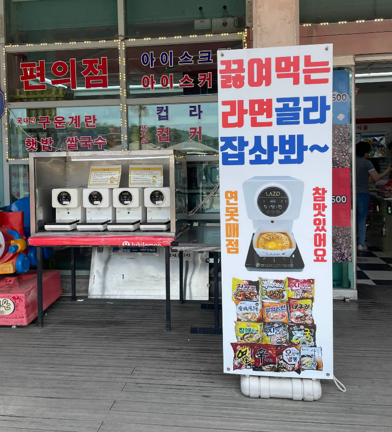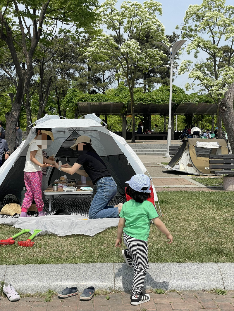 바로 계단 위 잔디 위에 텐트 자리 잡았어요. 아이들 케어하기 정말 편하네요 :-) 모래놀이 장난감만 다양하게 챙겨오고, 간식 준비해두면 아이들은 오며가며 먹고 놀아요. 친구와 저는 커피 마시면서 여유를 즐겨봅니다. 점심 도시락으로 김밥을 사왔어요. 그리고 상암 평화의공원 매점에는 한강라면이 있지요!